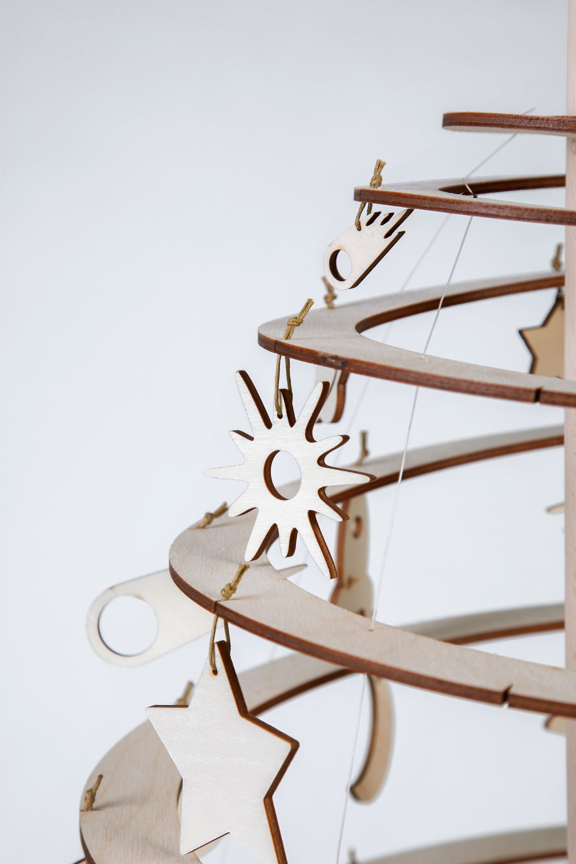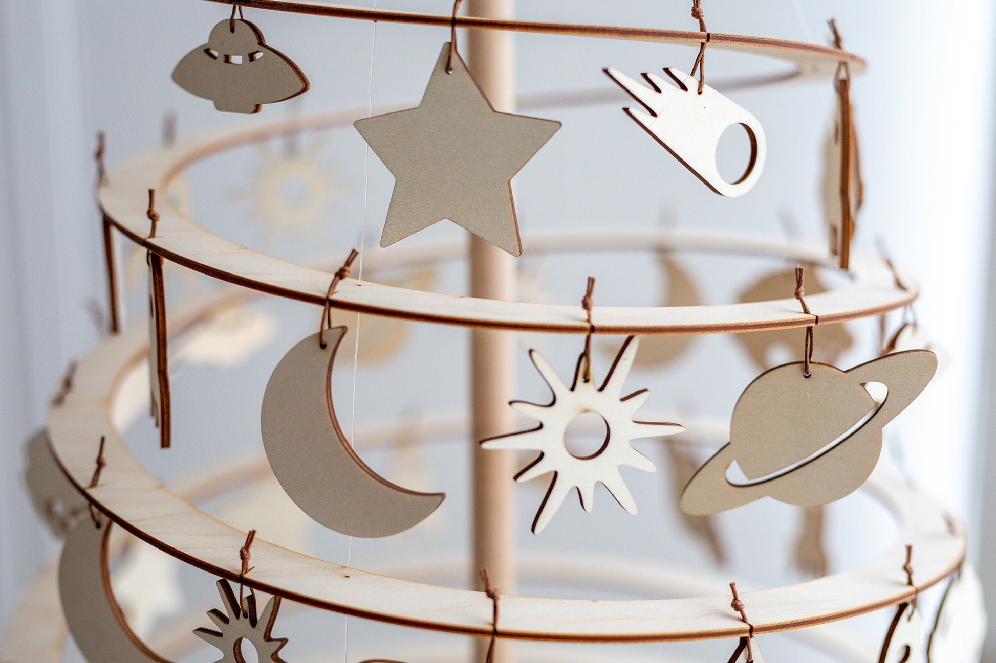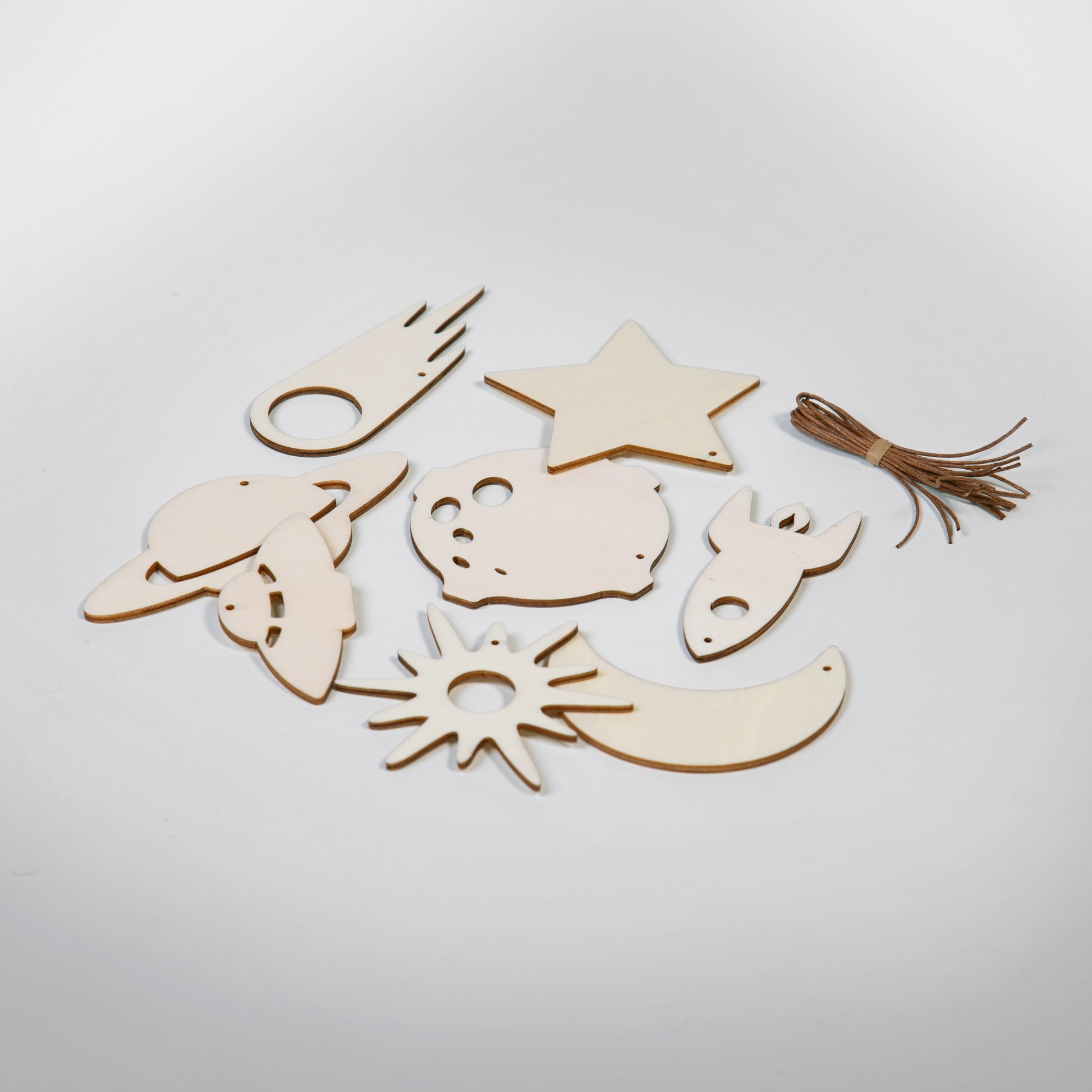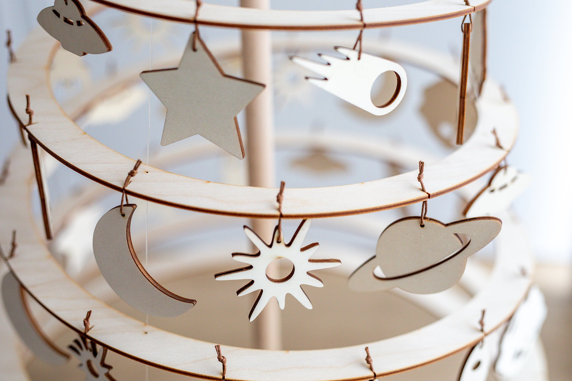 Un conjunto de adornos de madera de varias formas con temas espaciales es una excelente opción para interiores modernos y clásicos. El diseño atemporal y la calidez de la madera garantizan la perfecta decoración navideña de cada hogar.