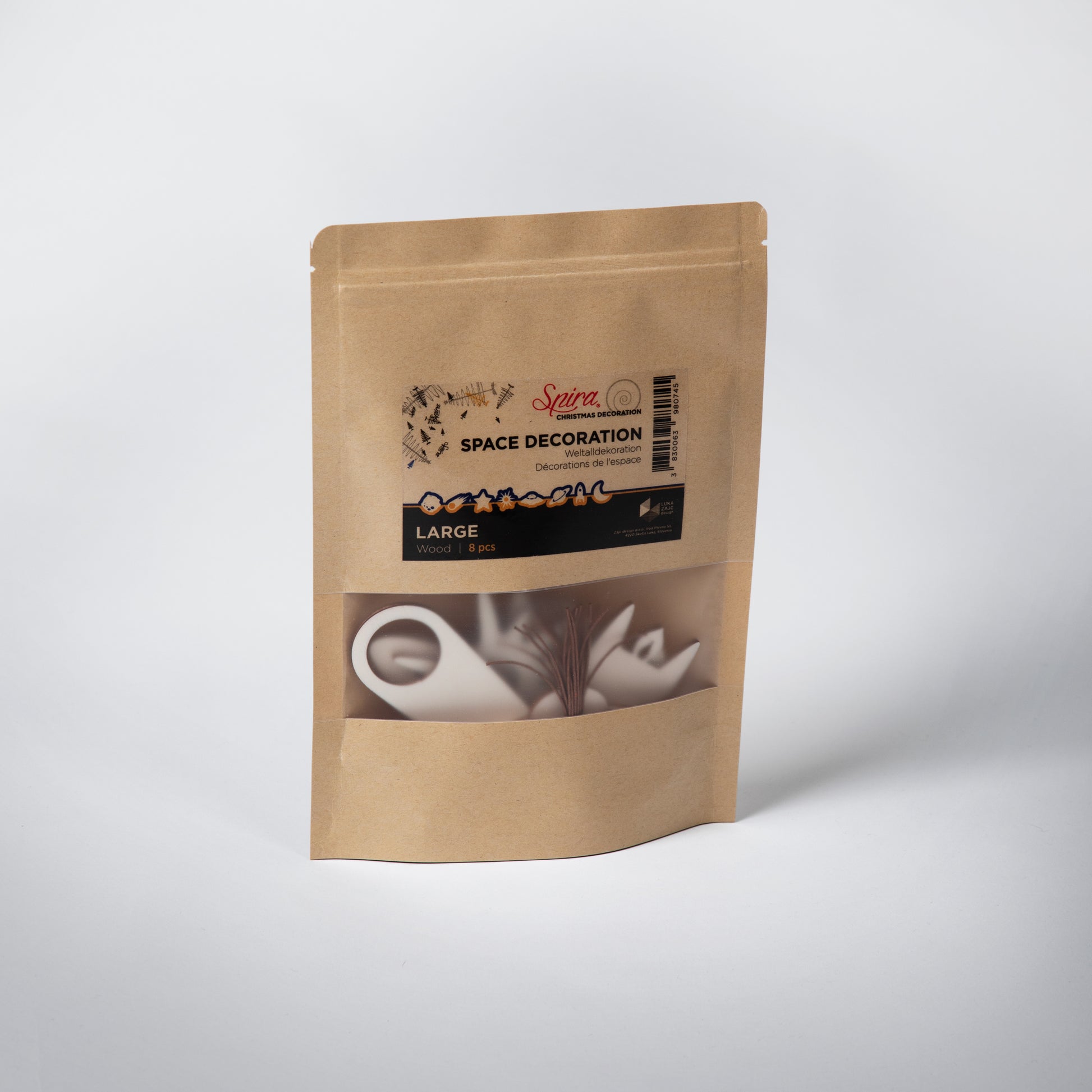 El juego contiene 8 adornos de fieltro con motivos espaciales. Los adornos están disponibles en tres tamaños diferentes. El juego también incluye cuerdas para colgar las decoraciones.