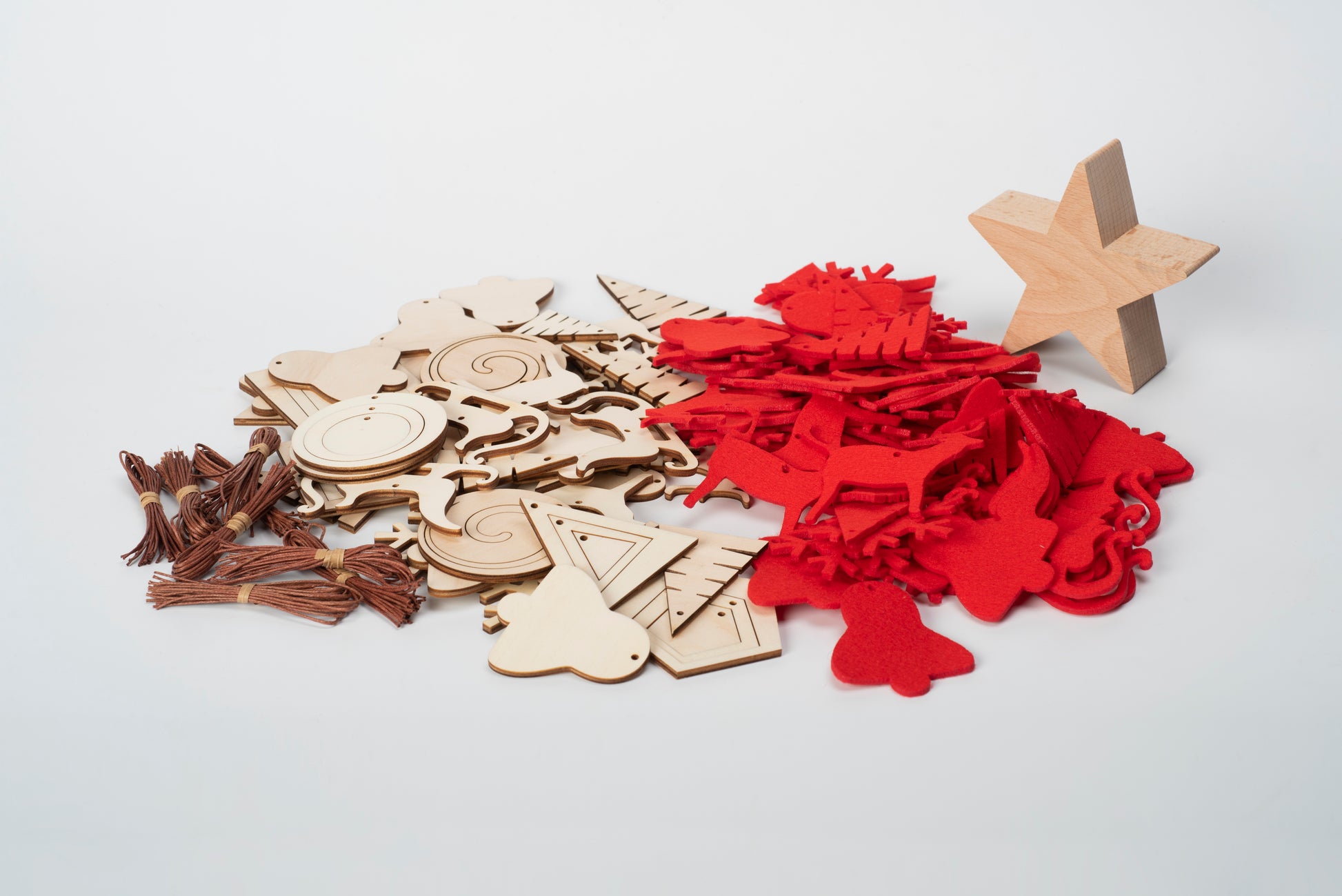 El juego incluye una estrella de madera para copa de árbol y una cantidad adecuada de adornos hechos de fieltro rojo y madera. Se incluyen cordones para colgar.
